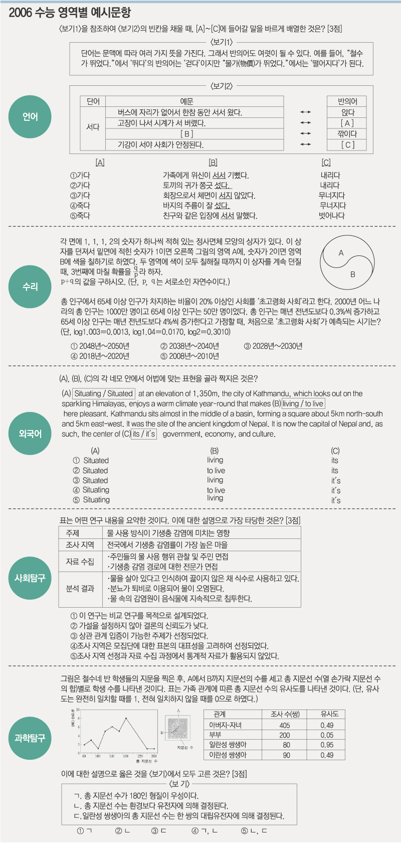 ▽사회탐구=과목별로 교육과정 전 범위에서 출제되지만 교과서 밖의 소재나 일상생활에서 접할 수 있는 내용과 시사문제도 출제 대상이다.