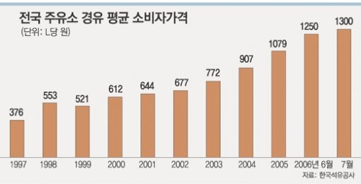 전국 주유소의 평균 경유가격은 2003년 772원이었으나 이번 인상으로 L당 1300원을 넘어섰다. 3년 만에 거의 두 배로 뛴 셈이다. 현재 서울 일부 주유소에서는 1400원대를 받고 있다. 사상 최고 가격이다.