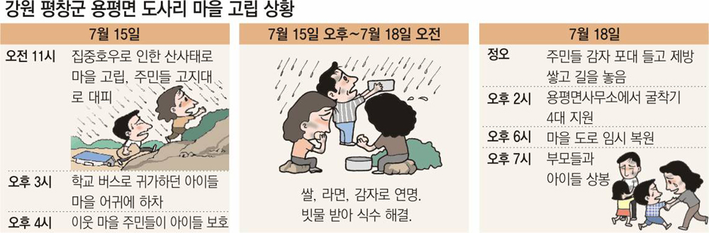 18일 빗줄기가 약해지자 주민들은 누가 먼저랄 것도 없이 감자 포대를 들고 나섰다. 포대에 모래를 가득 담아 제방을 쌓고 길을 놓았다. 용평면사무소에서도 굴착기를 지원해 이날 오후 6시가 돼서야 이들은 폐허가 된 마을에서 빠져나올 수 있었다.