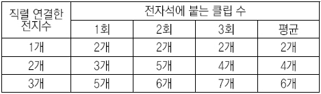 ※ 다음은 전자석의 세기에 영향을 주는 요인을 알아보기 위해 실험을 한 후 결과를 정리한 내용입니다. 이어지는 물음에 답해 보세요. (1∼3)