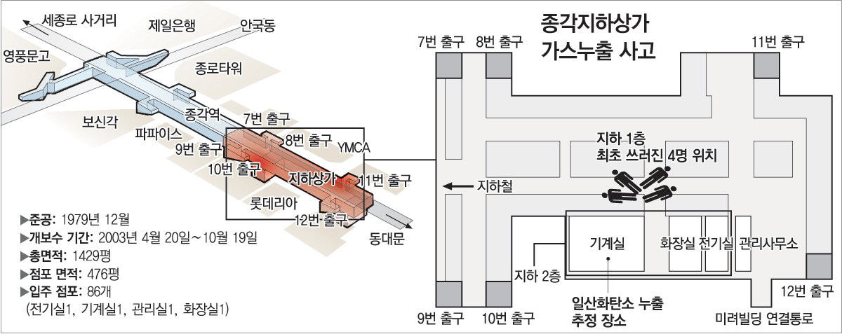 사고가 난 종각지하상가에는 모두 86개의 점포가 있다. 연면적은 1429평으로 축구장 절반 크기다.