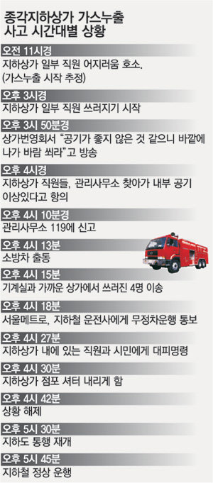 현장 조사에 나선 서울메트로 관계자는 “지하상가에 들어서자마자 머리가 어찔했다”고 말해 구조가 조금만 늦었다면 대형 참사가 될 수도 있었다.