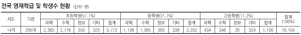학령별로는 2005년 기준으로 초등이 전체의 57.1%인 5700여 명, 중등은 31.7%인 3200여 명, 고등부도 전체의 11.2%인 1100여 명이다. 과목별로는 수학이 가장 많은 전체의 43.8%인 4400여 명, 과학은 전체의 39.1%인 4000여 명, 정보는 전체의 7.3%인 700여 명, 예능은 전체의 9.8%인 1000여 명이다.