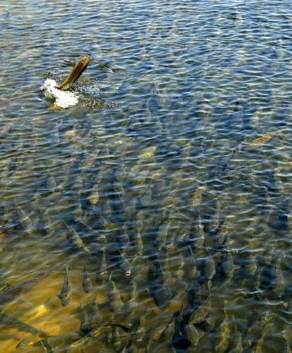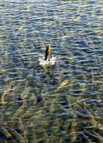 잉어떼입니다. 헤아릴 수 없을 만큼 많은 잉어떼가 물속을 헤엄치고 있습니다. 공원이나 유원지의 못에 기르는 잉어떼, 또는 양식장의 잉어떼 처럼 보이지만 영랑호에서 자연상태로 살아 가고 있는 잉어떼입니다.