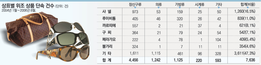 국회 산업자원위원회 소속 한나라당 이성권 의원이 29일 특허청으로부터 제출받은 ‘위조상품 적발 현황’에 따르면 2004년 1월부터 올해 8월까지 적발된 해외상표 위조 건수는 총 7636건이었고 이 가운데 16.5%인 1260건이 샤넬 상표를 붙인 제품이었다.