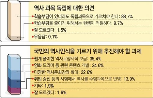 또 고시를 포함한 모든 공무원시험에 국사를 포함하라는 의견이 78.7%, 대학수학능력시험에 국사를 필수과목으로 지정해야 한다는 의견이 52.9%였다.