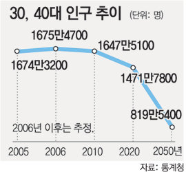 그러나 활발하게 일을 하는 30대와 40대(30∼49세) 인구는 올해 1675만4700명으로 사상 최대 인원에 도달한 뒤 내년에는 1671만6100명으로 줄어들 것으로 전망됐다. 이어 △2011년 1640만 명 △2030년 1308만2300명 △2040년 1080만8600명 △2050년 819만5400명으로 감소세가 지속될 것으로 보인다.