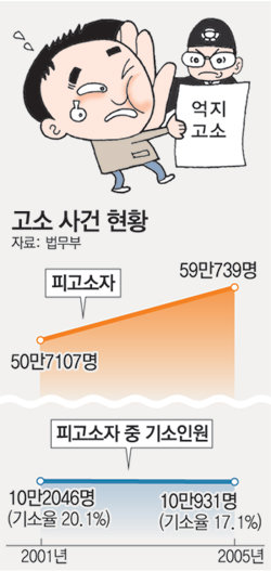 법무부에 따르면 지난해 피고소자는 59만739명으로 2001년(50만7107명)에 비해 16.5% 늘었지만 피고소인의 17.1%인 10만931명이 기소돼 2001년(10만2046명, 20.1%)에 비해 기소인원과 기소율은 오히려 줄었다.
