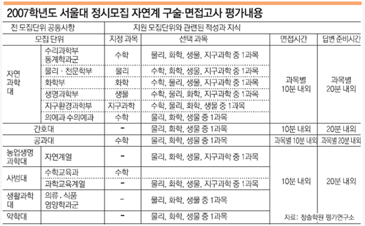서울대는 지난해 구술·면접에서 수학과목은 주로 풀이 유형의 문제를 출제했다. 과학은 과목별로 ‘차이점을 설명하라’, ‘이유를 설명하라’, ‘실생활에서 이용한 예를 들라’ 등의 문제를 냈다.