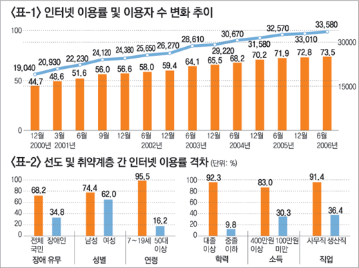 <표-2>는 한국정보문화진흥원의 보고서에 나온 표다. 이 자료에 의하면 2004년 장애인의 인터넷 이용률은 34.8% 정도로, 전체 국민 평균이용률의 절반 수준에 지나지 않는다. 월 가구소득 100만 원 이하 계층의 인터넷 이용률은 30.3%로 400만 원 이상의 계층과 52.7%포인트의 차이를 보인다. 그리고 50대 이상의 인터넷 이용률은 20% 미만이어서 7∼19세 젊은 계층과 무려 79.3%포인트의 차이가 있다.