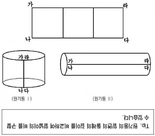 2. [도형] 다음 그림과 같이, 크기가 같은 정사각형 3개를 이어 붙인 직사각형 모양의 종이가 있습니다. 이 종이의 (가)와 (라), (나)와 (다)를 붙여서 만든 원기둥 I과 (가)와 (나), (라)와 (다)를 붙여서 만든 원기둥 II의 부피의 비를 구하시오.