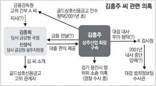 서울서부지검은 김 부원장이 금감원 비은행검사1국장(금고국장) 재직 시절인 2001년 3월 당시 금감원 광주지원장이었던 신 씨와 함께 김 회장을 골드상호신용금고 대주주에게 소개하는 등 김 회장의 인수 작업을 도운 것으로 보고 있다.