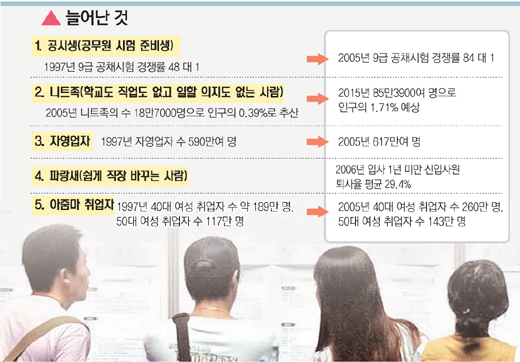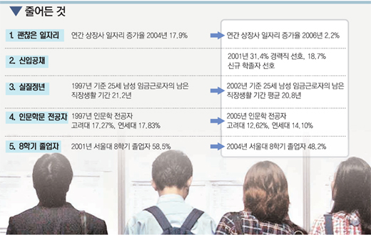 외환위기 4년이 지난 2001년 ‘사업체 인적자원의 운영실태 조사’에 따르면 조사 대상 사업체의 31.4%가 경력직을 선호하는 반응을 보였다. 반면 18.7%만이 경력이 없는 신입사원을 선호한다고 밝혔다. 자영업자도 늘었다. 통계청에 따르면 1997년 자영업자는 590만여 명이었지만 2005년에는 617만여 명으로 약 27만 명 증가했다.