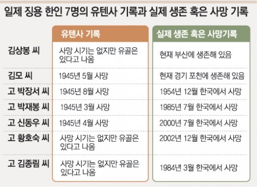 본보가 최근 유텐사에 보관돼 있는 한국인 유골 1135위(位) 가운데 남한 출신인 704위의 명부 중 일부를 확인한 결과 최소 7위의 유골이 다른 사람의 것으로 드러났다. 유텐사에 유골이 있다고 기록된 7명 중 2명이 국내에 생존해 있고, 5명은 종전 뒤 한국으로 돌아와 사망했다.