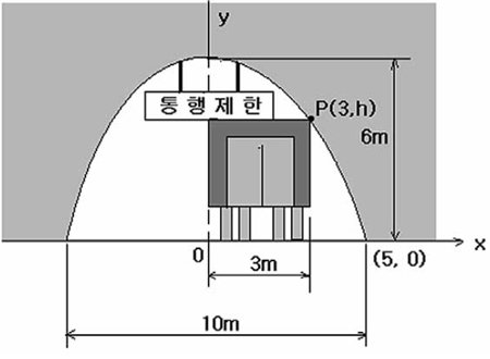 아래의 그림과 같이, 지면을 x축, 터널의 중앙을 y축으로 하자. 그러면 꼭짓점의 좌표가 (0, 6)이고, (5, 0)을 지나는 포물선에서 점 P의 y 좌표인 h값을 구하는 것이 이 문제를 해결하는 것이다.