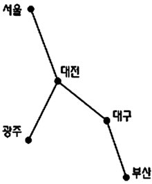 서울, 대전, 광주, 대구, 부산에 살고 있는 다섯 명의 친구가 그림과 같은 고속도로에서 자신의 차들을 이용하여 한 장소에 모이려고 한다. 차의 운행 거리의 합을 최소로 하려면 어느 곳에 모여야 할 지 설명하여라. (단, 광주에서 가장 가까운 곳은 대전이다.)