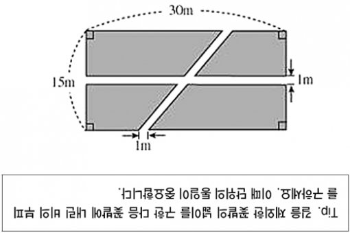 2. [측정] 그림과 같이 네 개의 색칠된 사다리꼴 모양으로 이루어진 꽃밭이 있습니다. 이 꽃밭에 물을 줄 때, 2L들이 물뿌리개를 사용합니다. 어느 날 강우량 1mm의 비가 내려서 이날은 물을 주지 않아도 되었습니다. 이날 꽃밭에 내린 비의 양은 2L들이 물뿌리개 몇 개의 양과 같은지 구하시오.