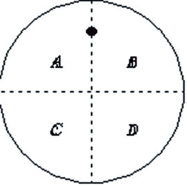우선 원의 경계 혹은 내부에 1개의 점을 찍고서 그 점과 원의 중심을 연결하는 지름을 긋고, 이 지름과 수직이 되는 지름을 한 개 더 그으면, 오른쪽 그림과 같이 이 원은 4개의 영역으로 나누어진다.