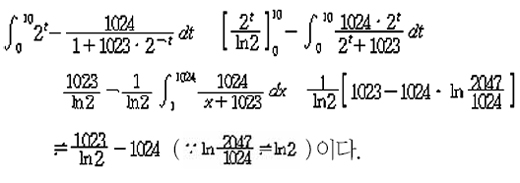 이므로 아래로 볼록인 함수이고, log₂1023〈t 에서