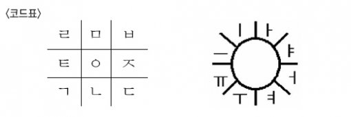 철수는 이 암호문을 해독하지 못하여 괴로워하였다. 그때 평소 철수를 사모하던 영희가 그 암호를 풀 수 있는 아래와 같은 코드표를 몰래 건네주었다.