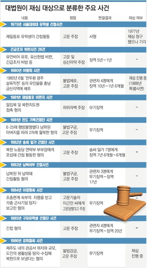 1981년 간첩 혐의로 기소돼 무기징역을 선고받고 수감된 재일동포 이헌치 씨 사건, 1983년 납북 어부 정영, 김정묵, 이상철 씨 사건도 문제의 소지가 있는 판결로 분류돼 있다. 간첩 혐의로 무기징역을 선고받고 가석방된 강희철(50) 씨 사건과 1980년 신군부의 광주민주화운동 탄압 실상을 전파했다는 이유로 중형이 선고된 ‘아람회’ 사건은 재심 청구가 받아들여졌다.