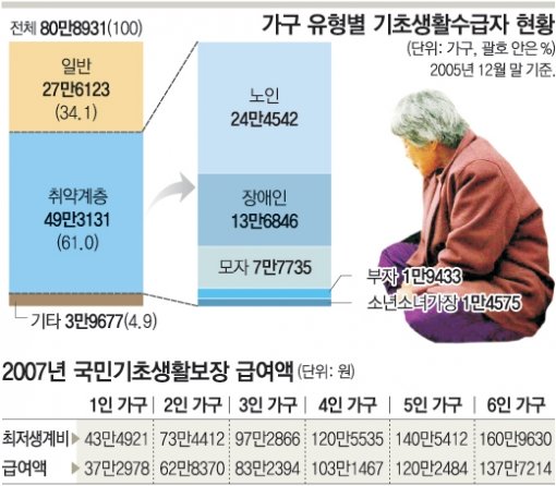 국민기초생활보장제도는 개인의 소득이 정부가 정한 최저 생계비에도 미치지 못하면 최소한 생활을 유지하도록 정부가 예산에서 지원해 주는 제도. 2005년 말 현재 전국의 기초생활수급자는 80만8931가구(142만5000여 명)며 이들에 대한 올해 지원 예산은 2조6696억 원이다. 이들 가운데 30.2%가 65세 이상 노인 가구지만 수급자 선정과 지급 기준이 현장밀착형이 아닌 탁상공론형이어서 이들의 목소리와 바람이 제대로 반영되지 못하고 있다.