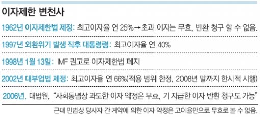▽이자제한법 부활하나=이자제한법(최고이자율 연 25%)이 시행되고 있던 1988년 9월 대법원은 “당사자 사이에 약정된 이율의 일부가 사회 질서에 반하는 것으로서 일부 무효가 된다 해도 당초 약정이율에 따른 이자를 임의로 지급한 경우에는 이를 무효라고 할 수 없다”며 “지급한 이자의 반환을 청구하는 것도 허용되지 않는다”고 판결했다.