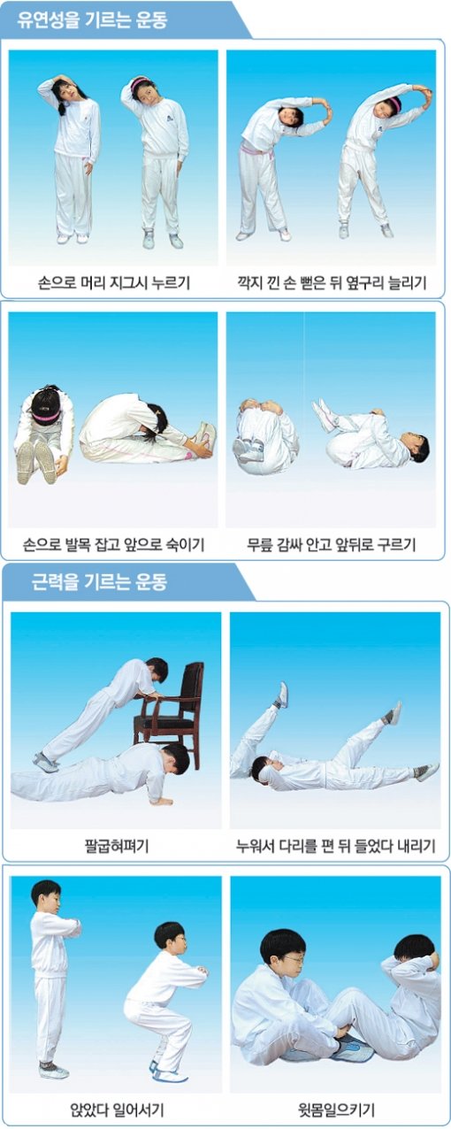 ▽어디서 운동할까=초등학생의 경우 학교에서 실시하고 있는 ‘방과 후 학교’ 프로그램을 이용하는 것이 좋다. 학교마다 차이는 있지만 축구, 농구, 탁구, 태권도, 무용, 발레, 스포츠댄스, 요가 등 각종 운동 종목을 배울 수 있다. 만약 자신이 다니는 학교에서 운영하는 스포츠 프로그램이 없으면 이웃 학교에 문의해서 참여할 수도 있다.
