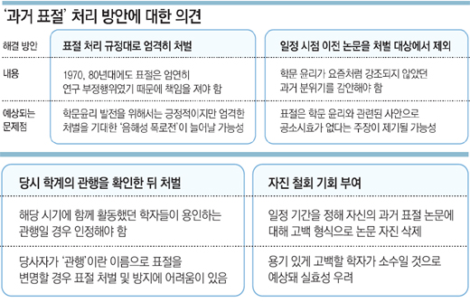 서울의 한 사립대 교수는 “몇 단어 이상을 무단으로 사용하면 ‘표절’이라는 엄격한 기준을 소급 적용할 경우 무사할 교수가 있겠느냐”며 “대부분의 연구자를 옭아매는 방식으로는 과거의 표절 문제를 해결하기 힘들 것”이라고 말했다.