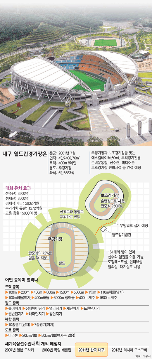 4년 뒤 여름 대구는 ‘육상 축제’의 열기에 휩싸인다. 월드컵 축구, 올림픽과 함께 세계 3대 스포츠 이벤트로 꼽히는 제13회 대구 세계육상선수권대회가 8월 말 개막해 9일간의 열전에 들어간다. 달리기와 던지기, 뛰기 등 47개 세부 종목(남자 24개, 여자 23개)에서 세계적인 선수들이 감동의 드라마를 준비하고 있다. 마라톤과 20km 경보, 50km 경보 등 도로 종목을 제외한 모든 종목은 대구월드컵경기장에서 열린다.