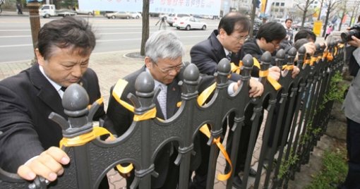 개방형이사제 등이 사학의 건학 이념을 훼손하므로 사립학교법을 재개정하라고 요구하며 무기한 단식 중인 서경석 목사(왼쪽에서 두 번째)를 비롯한 목사와 신도들이 12일 국회 담장을 붙잡고 기도하고 있다. 이종승 기자 urisesang@donga.com