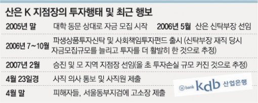 20일 금융계와 검찰에 따르면 산업은행 K(53) 지점장은 2005년경부터 최근까지 고등학교 및 대학 동문 등 지인들에게서 받은 수십억 원의 자금을 운용하다 원금에 큰 손실이 나자 지난달 말 은행 측에 사직서를 제출하고 주변 사람들과의 연락을 끊었다.