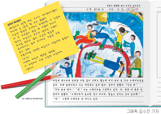 아이의 일기장 한 귀퉁이에 부모의 마음을 담은 짧은 편지(일명 ‘쪽지 편지’)를 남기는 것도 효과적이다(그래픽 참조). 자주 틀리는 맞춤법을 지적하고 고쳐 주고자 한다면 별도의 노트를 준비해 틀린 글자를 다섯 번씩 제대로 써 보게 한다.