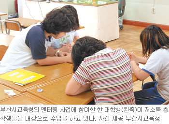 이 밖에 부산 북부교육청이 4월부터 덕천종합사회복지관 및 사상구자원봉사센터와 함께 지역 저소득층 학생들을 대상으로 대학생 멘터링 사업에 나서는 등 현재 부산지역 대학생 660명이 저소득층 초중고교생 6800명의 공부를 도와주고 있다.
