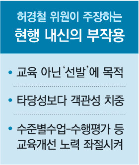 평가원 교육과정평가연구본부장을 지낸 허 연구위원은 이번 발표에서 “현행 내신은 학생들의 관심을 학교 안으로 끌어들이고 교사의 권위 유지와 지방 학생들의 상대적 박탈감을 해소하는 등 사회적인 가치는 있다”며 “그러나 내신이 상급 학교 진학을 위한 평가 수단이 됐기 때문에 내신을 확대할수록 부정적 효과가 커진다”고 주장했다.