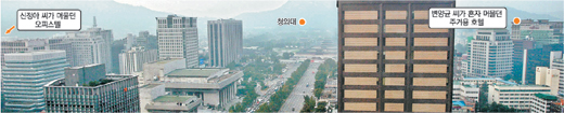변양균 전 대통령정책실장의 신정아 씨 비호 의혹이 대선 정국에 새로운 변수로 떠오르고 있다. 안개 속에 잠긴 청와대와 세종로를 사이에 두고 변 전 실장이 가족과 떨어져 혼자 머물렀던 ‘서머셋 팰리스 서울 레지던스’와 신 씨가 거주했던 ‘경희궁의 아침’이 마주 보고 있다. 안철민 기자 |