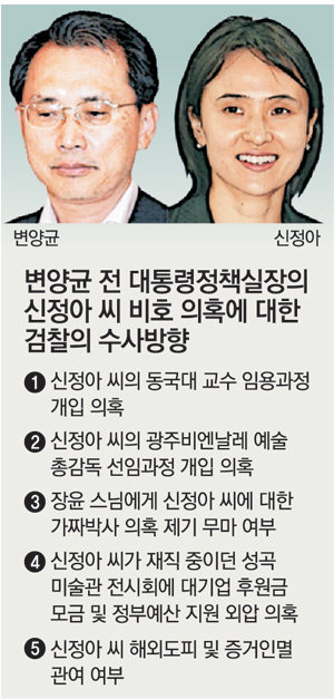한편 검찰은 변 전 실장이 신 씨가 서울 종로구 성곡미술관 재직 시절 기획한 전시회에 대기업 등의 후원을 받도록 영향력을 행사했는지를 조사 중이다. 그동안 대기업의 후원이 거의 없었던 성곡미술관은 신 씨가 큐레이터로 재직한 2002년 4월∼올해 7월 대기업과 금융기관에서 대규모 전시회 후원금을 유치했다.