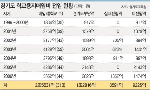 도교육청 관계자는 “경기도에서 매입비를 제대로 받지 못해 도교육청이 학교 용지를 사들이느라 한국토지공사 등에 8000억 원대의 빚을 졌다”며 “경기도가 누적된 매입금을 주지 않는다면 소송도 불사할 것”이라고 말했다.