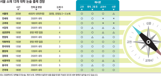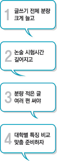 먼저 예년과 달라진 부분을 살펴보지요. 오른쪽 표에서도 확인할 수 있듯이 가장 큰 차이는 글쓰기 분량과 시간이 대폭 늘어난 점입니다. 논술시험의 변별력을 높이겠다는 것이지요.
