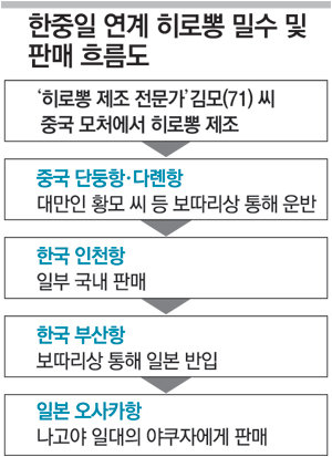 김 씨 등은 지난해 10월∼올해 6월 7차례에 걸쳐 히로뽕을 인천항을 통해 국내에 들여와 일본 야쿠자와 국내 가정주부 등에게 판매한 혐의다. 이들이 밀수한 히로뽕 약 6.7kg은 22만4000여 명이 투약할 수 있는 양이며 소매시가 기준으로 224억 원(검찰 추산)에 이른다.