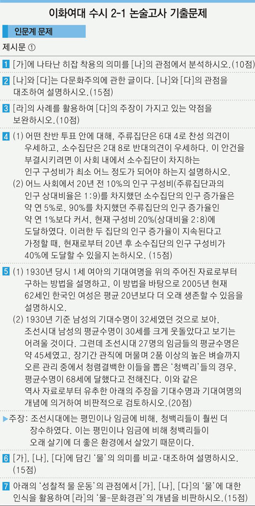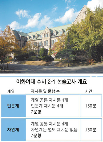 이화여대 논술에는 인문계든 자연계든 모두 풀어야 하는 ‘계열 공통 문제’가 있다. 이번 수시 2-1 논술시험에서는 전체 7문항 중 절반에 가까운 3문항(1∼3번 문제)을 공통으로 출제했다. 공통 문항은 모두 인문·사회 관련 논술 문제. 자연계 수험생도 인문계처럼 글쓰기를 집중 연습해야 한다는 결론이 나온다.