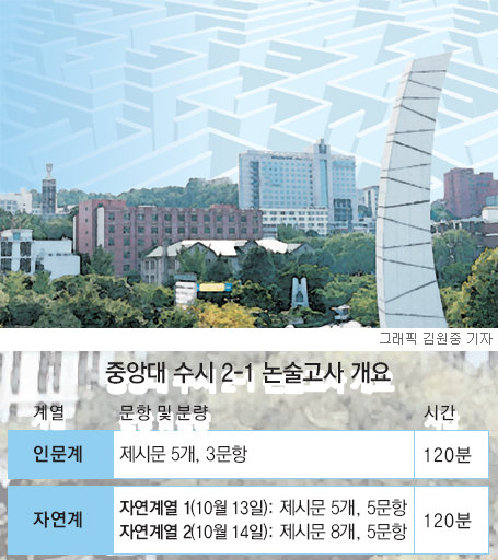 중앙대는 인문계와 자연계를 가릴 것 없이 언어논술과 수리논술을 모두 보아야 했던 기존 시험 유형을 올해부터 바꿨다. 인문계는 통계자료를 해석하는 문제로 수리논술을 대체했고, 자연계는 과학을 소재로 한 짧은 글쓰기로 언어논술을 대신했다.