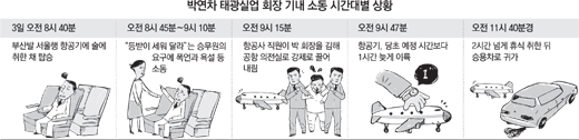 ▽기내 소동=대한항공에 따르면 박 회장은 3일 오전 8시 40분 부산발 서울행 대한항공 KE1104편 비즈니스석에 탑승했다.