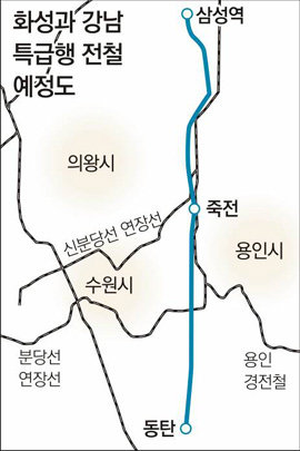 ▽고속급행전철=도가 구상 중인 노선은 화성 동탄2신도시∼서울 강남 삼성역 구간. 길이 38km, 중간 정차역 1개, 공사비 3조 원으로 예상한다.