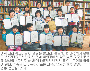‘작은 도서관 만드는 사람들’(대표 김수연)과 동아일보, 네이버가 함께하는 ‘고향 학교에 마을 도서관을’이 구정초교를 찾은 날. 개관식 며칠 전부터 준비해 온 작은 행사가 열렸다. 이름 하여 ‘학교마을도서관 개관 기념 봄맞이 백일장’. 전교생이 참여해 정성껏 글 솜씨를 부렸다. 좋은 글귀도 뽑아 그림까지 곁들여 학교 마당에 걸었다.