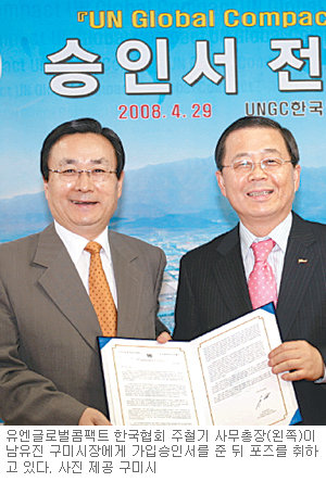 UNGC는 4개 분야에서 △인권침해 방지 △단체교섭권의 인정 △환경친화적인 기술 개발 △뇌물 등 모든 부패에 반대 등 10가지 원칙을 통해 국제사회의 협력을 강화하는 게 목표다.