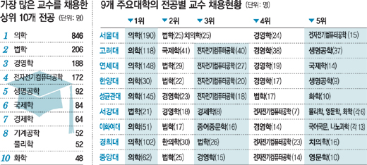 의학 다음으로 많은 교수를 뽑은 전공은 법학(206명) 경영학(188명) 전자전기컴퓨터공학(172명)으로 이들 전공에서 임용한 교수는 전체 채용 교수의 절반 정도(44.6%)를 차지했다.