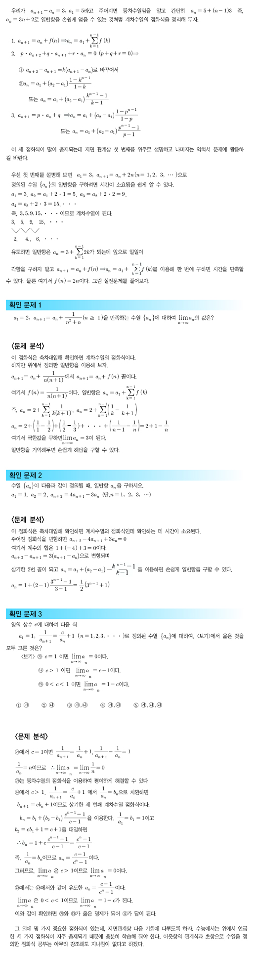 《수열을 공부하면서 수험생들이 가장 힘들게 느끼는 부분이 점화식이다. 그중에서도 계차수열의 점화식은 출제빈도가 높은데, 기본적인 등차·등비수열의 점화식처럼 일반항을 정리해 두면 시험장에서 일일이 축차대입하며 규칙을 찾지 않고도 간단히 문제를 풀 수 있다.》