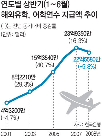 상반기 기준으로 전년 동기 대비 해외 유학, 연수비 대외지급액이 줄어든 것은 2001년(―4.7%) 이후 7년 만이다. 또 올해 상반기 감소 폭은 외환위기가 한창이던 1998년(―35.0%) 이후 10년 만에 최대였다.