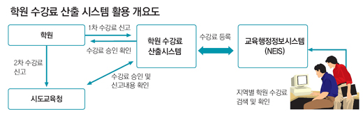 교과부와 시교육청은 앞으로 학원에 대한 기본정보와 ‘학원 수강료 산출 시스템’을 통해 승인된 학원 수강료를 교육행정정보시스템(NEIS)에도 연결해 학부모가 수강료 정보를 손쉽게 검색할 수 있도록 방안을 갖추기로 했다.